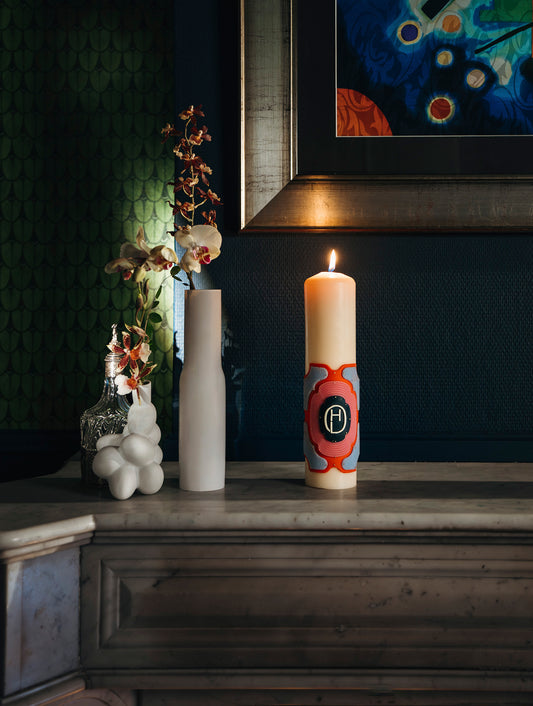Statuesque and statement-making, Immanuel is a spin on the traditional altar candle. The collection pushes our candle craftsmanship to new heights – literally, as the largest version soars to 1 m tall. Each handmade element involves a high level of difficulty, from the colouring, layering and application of the decorative wax relief to the drilling of the glossy candle’s base to ensure it fits flawlessly on its corresponding holder’s spike. The optimal cotton wick and wax quality combine for a perfect-burning candle.
