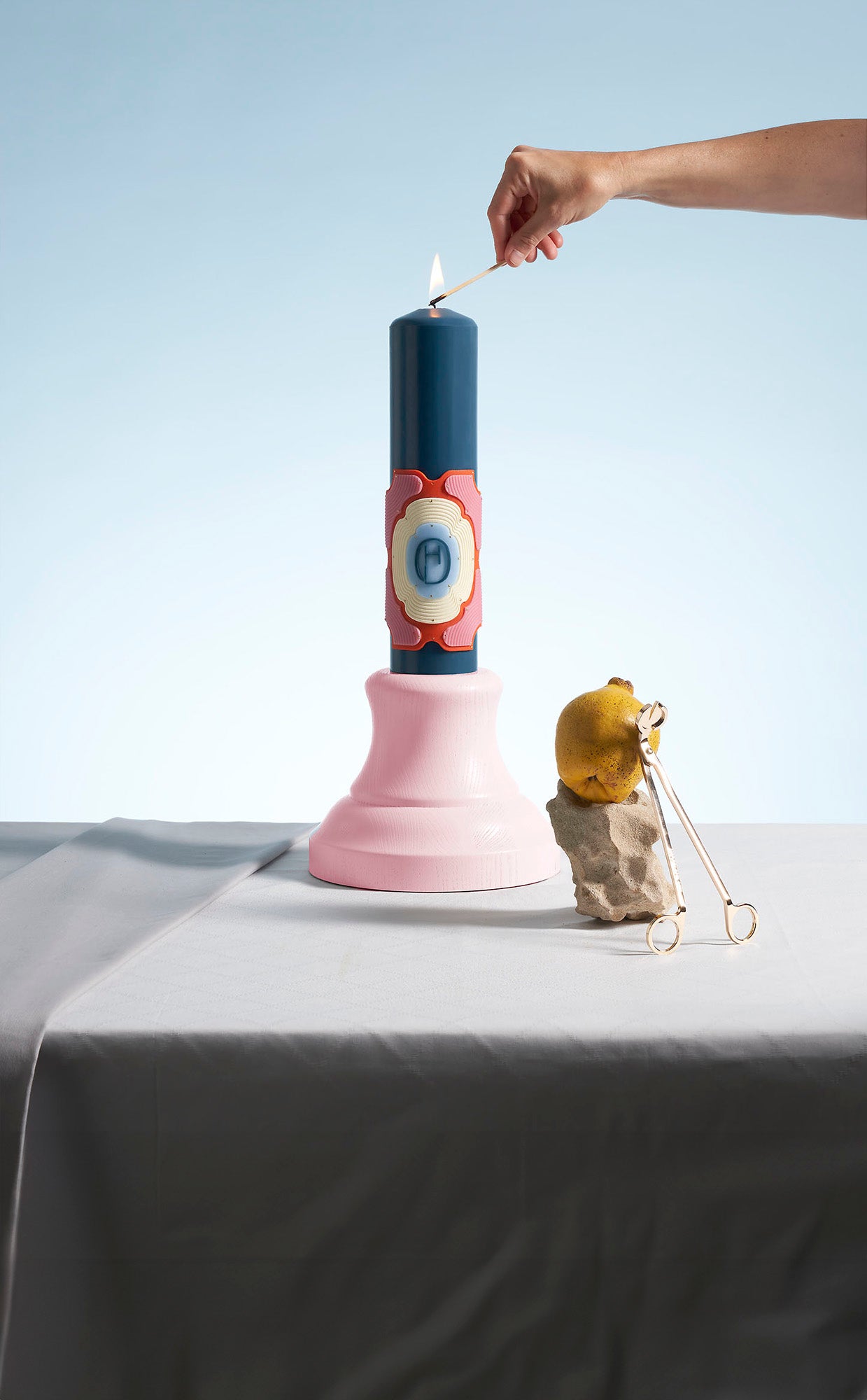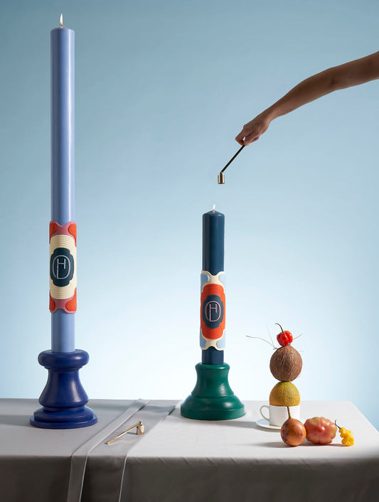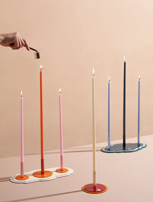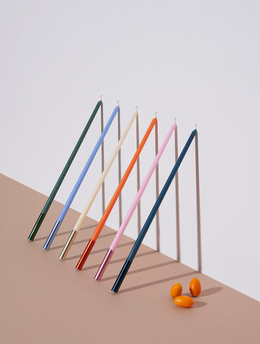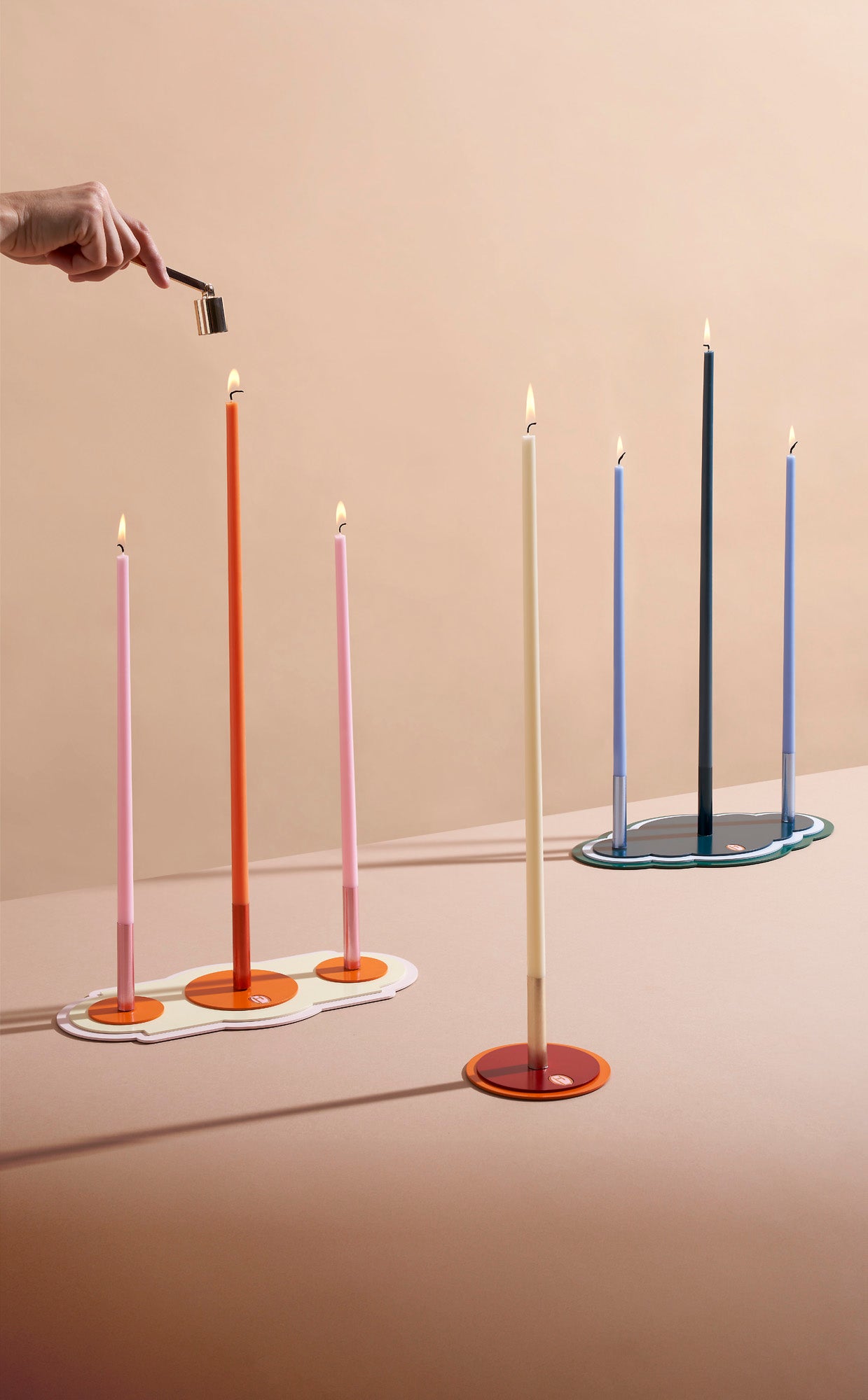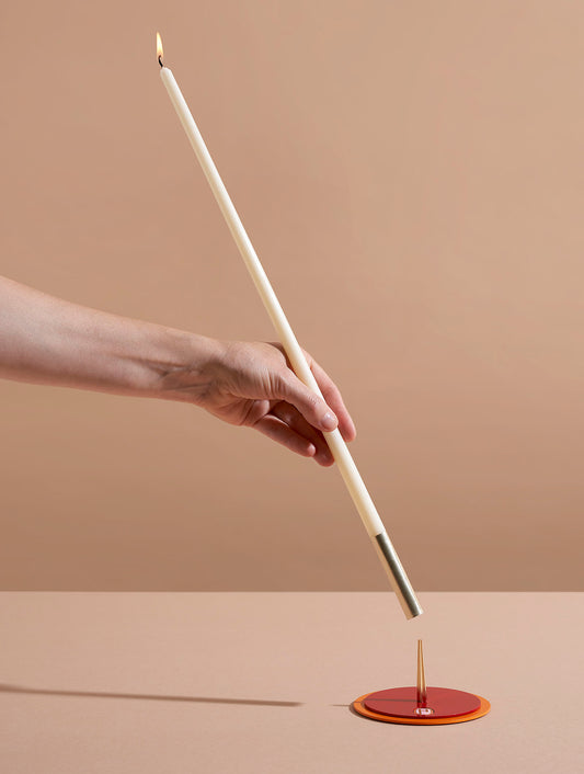 Slender, elegant, glossy candles and matching metallic holders work together seamlessly to create Catharine. There’s a strong sense of ritual involved in assembling the set: the unboxing of each handcrafted candle, the delicate clasping of the metallic foil at the bottom, the aligning of the hole at the candle’s base to its identically sized spike to slot it perfectly in place. The design – combined with the optimal cotton wick and wax quality – offers a premium, drip-free burning experience.