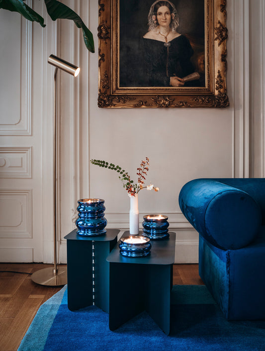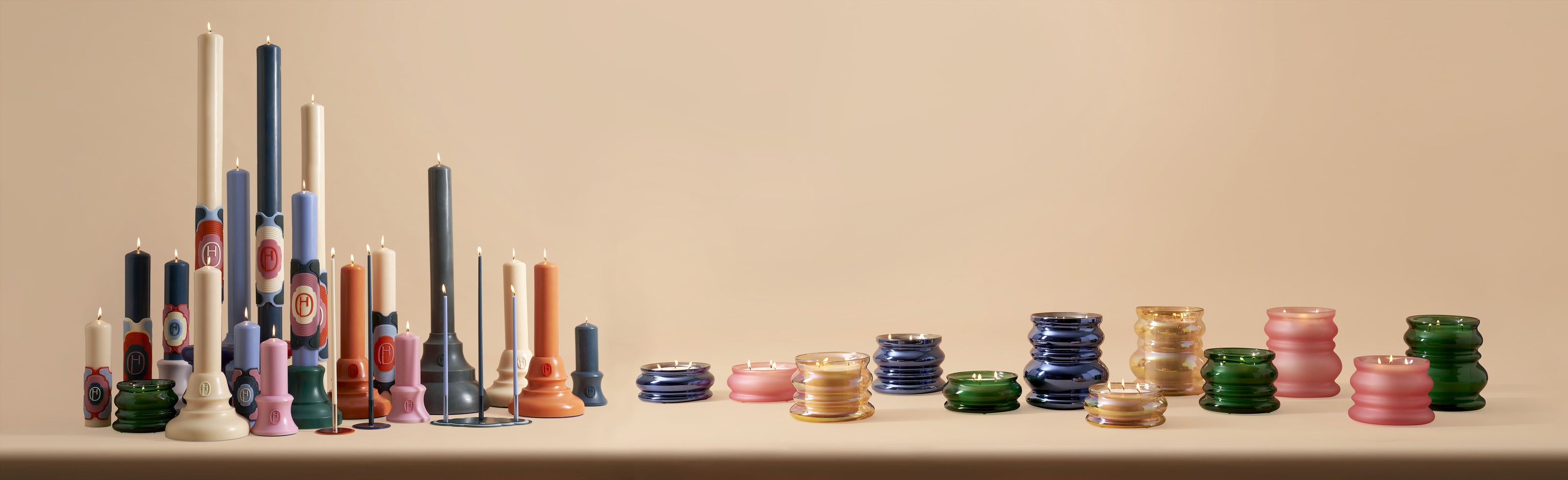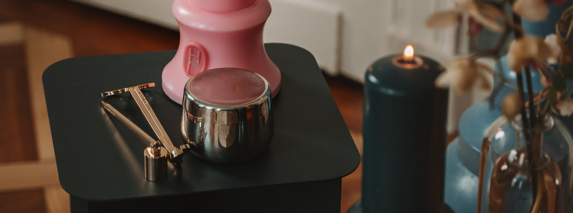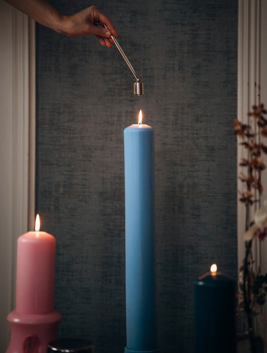 Slender, elegant, glossy candles and matching metallic holders work together seamlessly to create Catharine. There’s a strong sense of ritual involved in assembling the set: the unboxing of each handcrafted candle, the delicate clasping of the metallic foil at the bottom, the aligning of the hole at the candle’s base to its identically sized spike to slot it perfectly in place. The design – combined with the optimal cotton wick and wax quality – offers a premium, drip-free burning experience.